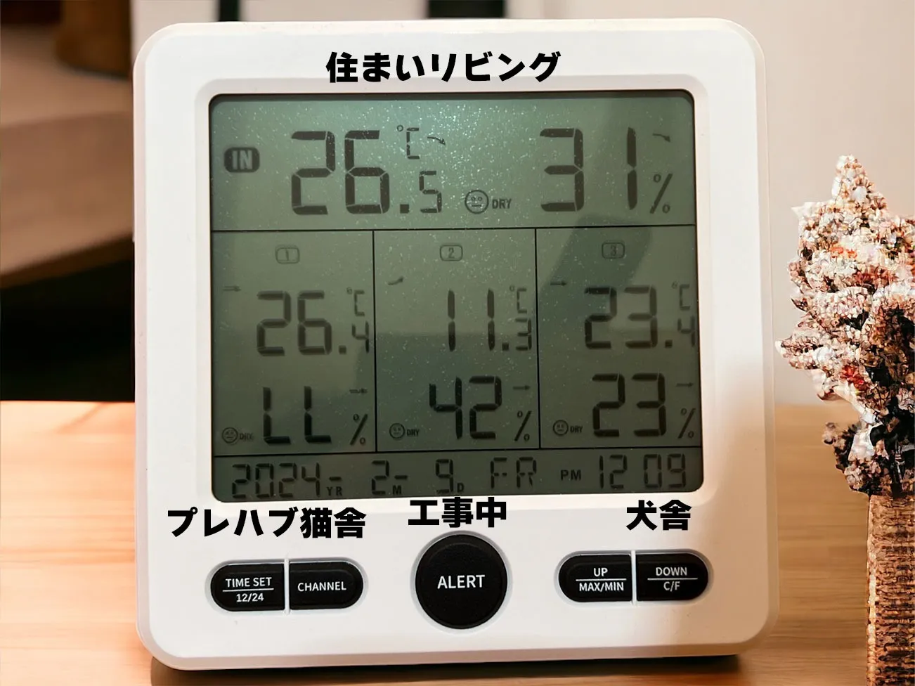 プレハブ猫舎は温度は高いですが湿度が20%以下になってしまうのでエラー表示です。